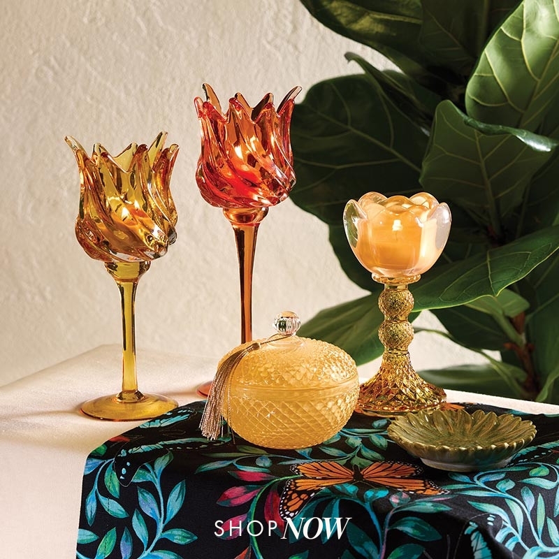 Think of the shades you might find on a walk through a garden or at a farmers market. Citrus orange paired with leafy green. Soft blush sitting beside warm ivory. Amber glass resting near natural wood tones.